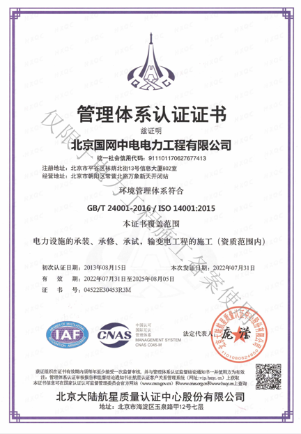 北京國網(wǎng)中電電力工程有限公司,已取得國家電監(jiān)會頒發(fā)的《承裝(修、試)電力設(shè)施許可證》、為電力施工承裝四級、承修四級、承試四級企業(yè)。北京市住房和城鄉(xiāng)建設(shè)委員會頒發(fā)的房屋建筑施工總承包二級、機電設(shè)備安裝工程專業(yè)承包二級、輸變電專業(yè)承包二級、城市及道路照明工程專業(yè)承包二級、市政公用工程總承包二級資質(zhì)、勞務(wù)不分等級,已通過ISO9001:2015 GB/T50430-2017質(zhì)量管理體系、GB/T24001-2016/ISO 14001:2015環(huán)境管理體系、